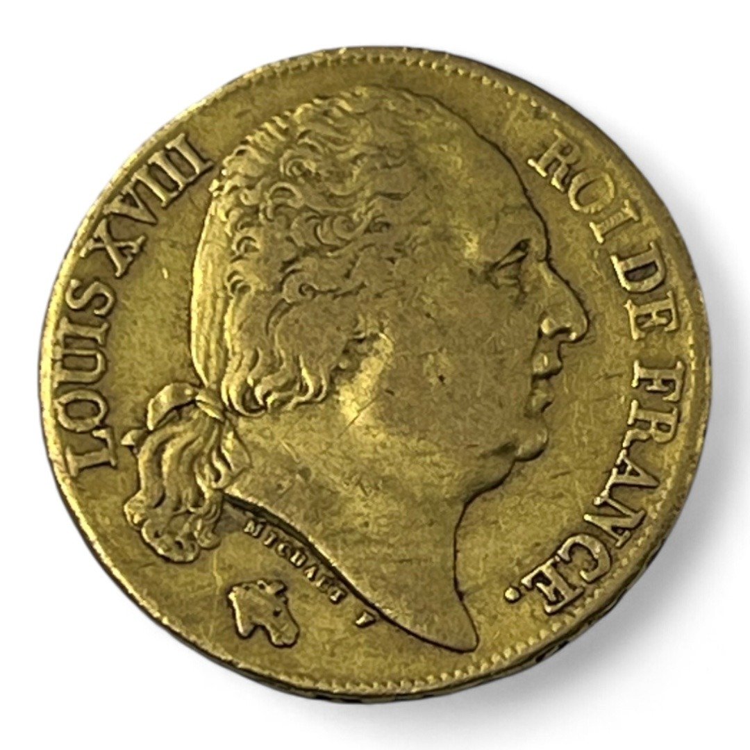 Monnaie de 20 francs Louis XVIII. L’atelier Nantais est rare, seulement 16,108 exemplaires frappés!